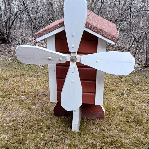Tuulimylly pihan koristeeksi, harjakorkeus n. 1m, korkeus siiven päähän n. 1,25m. Siivet ja myllyn kääntyminen kuulalaakeroitu, yhteensä 4 laakeria. Saranoitu ovi ja oikea ikkuna. Uusi, ei ole ollut pihalla kuin kuvauksen ajan. Punainen, okra - valkoinen ja okra - ruskea mylly myös myynnissä, katso ilmoitukset Torissa.