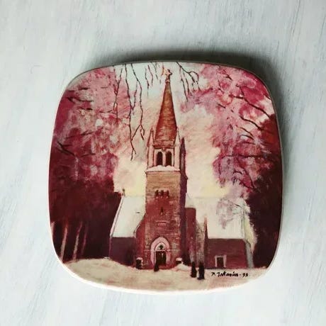 Arabia Nilsiän goottityylinen kvartsiittikirkko 1800-luvulta seinälautanen. Design Pentti Iskanius. Numeroitu 57/300.