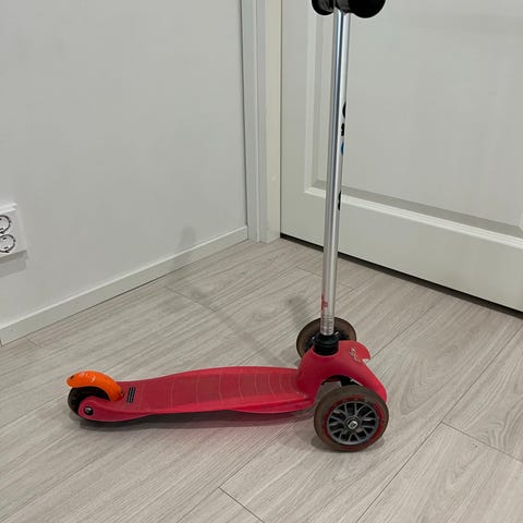 Micro Maxi skuutti lapsille. Mallissa on kolme pyörää, kaksi edessä ja yksi takana. Takana on jalkajarru takapyörän päällä. Kunto on kohtalainen: renkaat jo kuluneet, uusia saa varaosina.
