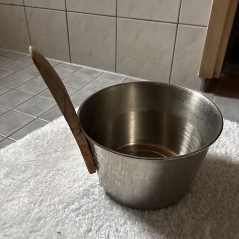 Saunasetti, johon kuuluu puinen poltettukiulu muovisella sisäosalla, puinen poltettu saunakauha sekä puuvillapyyhe. Kiulussa on kantamista helpottavat köysikahvat. Pyyhe on vaalean ja harmaan sävyinen, raidallinen puuvillakangas. Sopii saunassa käytettäväksi löylyveden nostamiseen ja kuivatteluun.