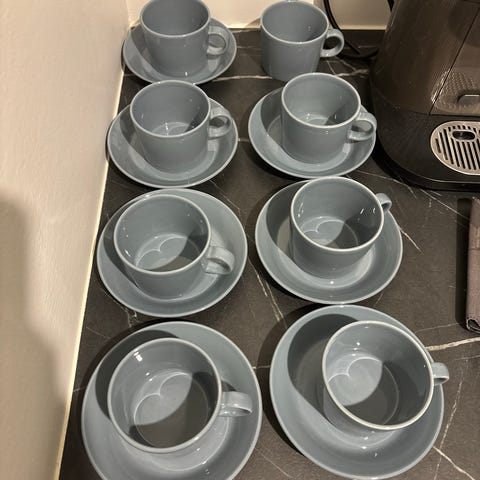 Iso matala malli, ei siis normi matala kahvikuppi, vaan leveämpi malli. Muumimuki verrokkina, eli muumimukia hieman matalampi ja leveämpi. Tarrat kellastuneet, joten varmaan parempi nypätä pois. Muutoin virheettömät.