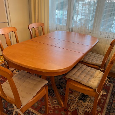 Sotka ruokapöytä, . Ovaalinmuotoinen, jatkettava puinen pöytä, jossa keskellä lisäosa pituuden kasvattamiseen. Pöydän kansi on vaaleaa puuta, jalat ja runko samaa puumateriaalia. Pöydässä on käytön jälkiä ja naarmuja kannen pinnassa. Sopii ruokailutilaan tai keittiöön useammalle istujalle. Mitat 150x95 lisä osa keskelle 450 cm penkkejä 6 kpl