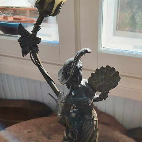 Hauska, isohko ja erikoinen posliininen pöytävalaisin, jossa mysteerimies seisoo lyhtypylvään juuressa. Kupu on lasia.