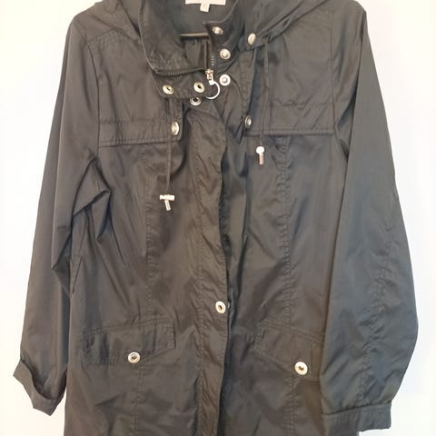 Dixi Coat naisten takki, koko 42. Musta takki, jossa valkoinen pilkullinen kuosi. Suora, polven yläpuolelle ulottuva malli, pitkät hihat ja pyöreä pääntie. Edessä nappikiinnitys ja sivutaskut.