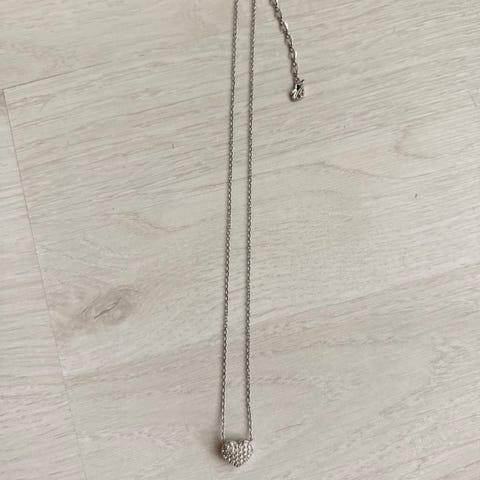 Kaunis kaulakoru Swarovski-kristalleilla. Hopeanvärisen ketjun pituus ilman korua 47 cm, sydämen koko noin 3 x 3 cm. Hyväkuntoinen, vähän käytetty.