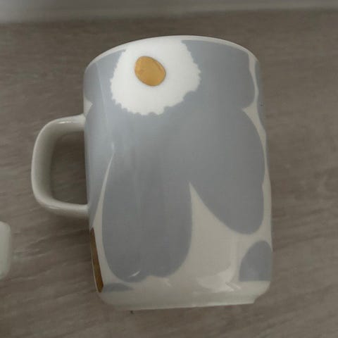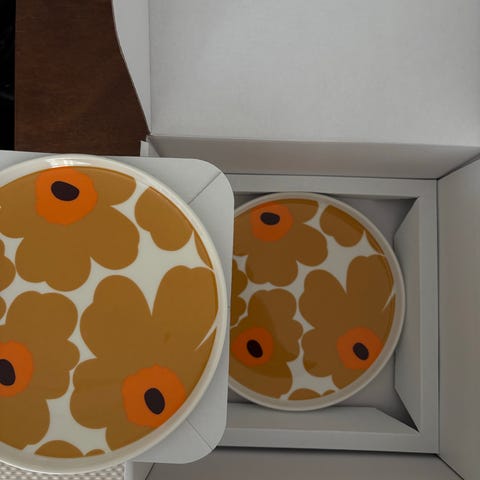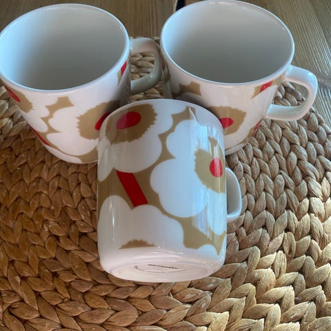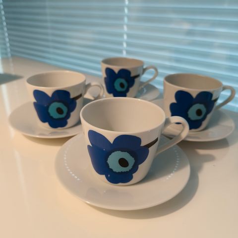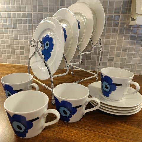 Marimekko Unikko astiasetti sinisellä kukkakuosilla. Kahvikupeissa ja lautasissa on sininen Unikko-kuvio. Settiin kuuluu 6 kahvikuppia, 6 tassia, sekä 6 lautasta. Yhdessä lautasessa on hieman elämisen jälkiä. Bonuksena saat mukaan vielä 2 hyväkuntaista tarjoilulautasta (muovi) joiden halkaisijat ovat 20 ja 25 cm!