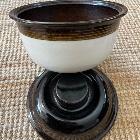 Kermansavi aamiaissetti, johon kuuluu kahvikuppi ja alulautanen. Setti on ruskeasävyinen, kupissa vaalea alaosa ja tummempi yläosa. Lautasessa on ovaali muoto ja syvennys kupille. Materiaalina on lasitettu keramiikka.