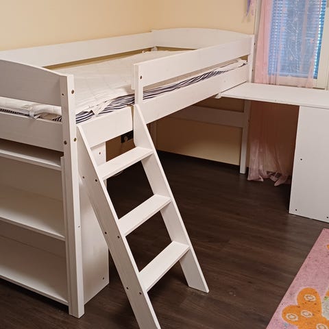 Muurame Jungmanni parvisänky. Valkoinen runko, jossa ylävuode ja avoin tila alapuolella (alle mahtuu esim pieni nojatuoli), toisella puolella sänkyyn kuuluva hyllylevy. (Kuvien irtohyllykkö oik. puolella ei kuulu kauppaan). Kunto hyvä käytetty. Pinnassa joitain jälkiä/värjäymää mutta yleisilme siisti. Kts. kuvat. Sängyn alapuolisessa rimoituksessa ollut kiinni lamppusarja pienillä koukuilla (kts kuvat). Koukut voidaan jättää tai poistaa.