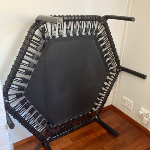 Pyöreä sisäkäyttöön soveltuva trampoliini. On Aconin Fit-mallistossa ollut aikanaan mutta meillä pääosin lapset hyppineet sisällä. Metallinen runko, useita tukijalkoja. Soveltuu esimerkiksi kotijumppaan ja kevyisiin hyppyharjoituksiin sisätiloissa max 90kg painoiselle.
