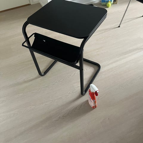 Musta neliön muotoinen sivupöytä. Kunnossa, pieniä naarmuja reunoissa