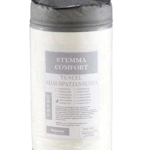 Sijauspatjan päälle kiinnitettävä suojus helpottaa vuoteen puhtaanapitoa. Kumilenkeillä kulmista kiinnitettävä Stemma-sijauspatjan suoja on helppo laittaa paikalleen ja irrottaa. Suojus voidaan pestä 60 asteessa.