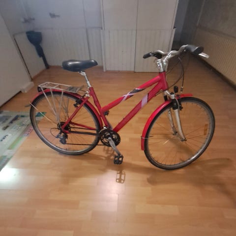 Kenen vain ajettava ja täysin toimiva ehjä (paitsi jalka puuttuu) pyörä. Pyörähuolto pikatarkistanut ei löytänyt ongelmia. Yksinkertainen rakenne kun on.