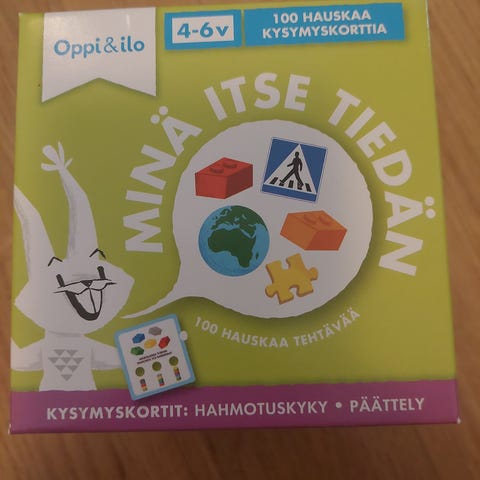 Oppi&ilo Minä itse osaan vastata on kysymyskorttipeli lapsille. Peli sisältää hauskoja kysymyskortteja, joissa on kuvia ja vastausvaihtoehtoja. Kortit tukevat lapsen kielellistä kehitystä, päättelytaitoja ja keskittymistä. Peli sopii yhteiseen tekemiseen kotona tai varhaiskasvatuksessa. Kortit ovat värikkäästi kuvitettuja, ja niitä voidaan käyttää sekä yksin että yhdessä aikuisen tai muiden lasten kanssa.