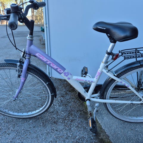 Lasten polkupyörä, jossa 24" renkaat. Runkoväri valkoinen ja vanteissa vaaleanpunaiset yksityiskohdat. Pyörässä on matala runko helpottamaan kyytiin nousemista, jalkajarru takana ja käsijarru edessä. Varusteluun kuuluu takatavarateline ja lokasuojat edessä ja takana. Soveltuu arkipyöräilyyn ja koulumatkoille lapselle, jolle 24" rengaskoko on sopiva.