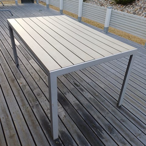 Myydään terassipöytä, jossa harmaa metallirunko ja neliönmuotoinen, karkaistu lasikansi. Pöydän keskellä on reikä aurinkovarjolle. Jaloissa kuvanmukaisesti kulumaa ulkosäilytyksestä, tukeva kuitenkin.