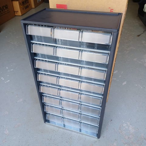 Treston pientavaralaatikosto, jossa on 24 kpl pieniä muovisia vetolaatikoita. Rungon väri on harmaa ja laatikoissa on etupuolella paikat nimikelapuille. Soveltuu pientarvikkeiden, kuten ruuvien, muttereiden, sähköosien tai muiden pienten osien säilytykseen ja lajitteluun esimerkiksi verstaalla, autotallissa tai varastossa.