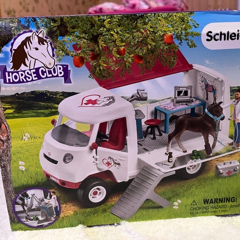 Schleich eläinlääkäriauto -lelusetti, johon kuuluu valkoinen eläinlääkäriauto, varsa sekä eläinlääkäri tarvikkeineen. Auton sivu ja katto avautuvat, sisällä on tutkimustila pöytineen, jakkara ja tutkimusvälineitä. Takana on ramppi hevosen lastausta varten. Lähes kaikki osat pitäisi olla tallessa. Jakkaran yksi jalka on irronnut, mutta pysyy pystyssä jos nojaa esim. pöytään. Alkuperäinen hinta noin 55€