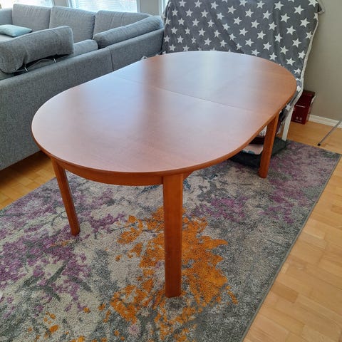 Hyväkuntoinen ruokapöytä, ollut autotallissa säilössä. Merkki ei tiedossa, vakaa pöytä. Yhdessä kulmassa pieni lommo, muuten moitteeton kunto