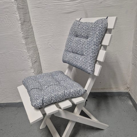 Riipputuoli ulkokäyttöön. Metallirunko ja verkkomainen istuinosa. Tuolissa on erillinen istuin- ja selkätyyny sekä niskatyyny sinisen sävyissä. Sopii esimerkiksi terassille tai parvekkeelle rentoutumiseen ja oleskeluun. Runko siisti, pehmuste haalistunut auringossa ja reikiä paikattu.