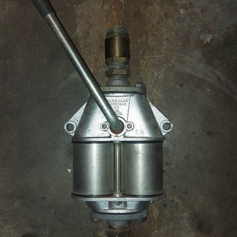Ehjä ja toimiva, käytössä ollut käsipumppu. Käytetty vain veden pumppaamiseen, mutta soveltuu myös öljyn ja glykolin pumppaamiseen.