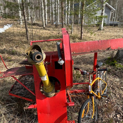 Traktorikäyttöinen klapisirkkeli ja ulosottoakseli. Terä pyörii. Hihnaveto. 3-pistekiinnitys.