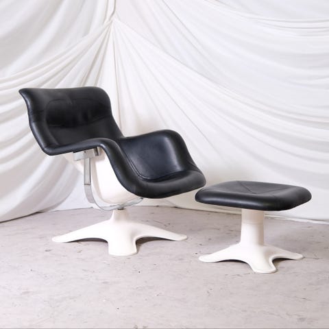 Myydään Ilmari Lappalaisen suunnittelema Pulkka-nojatuoli ja siihen kuuluva rahi. Verhoiluna näyttävä lehmäkuosinen canvas ja valkoinen metallirunko.