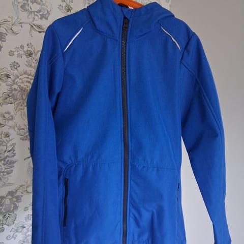 Kevyt sininen takki. Oranssi vuori. Koko 170. Kiinnitys vetoketjulla. Taskuissa vetoketjut. Irroitettava huppu. Joustavat hihansuut missä peukalon reikä.
