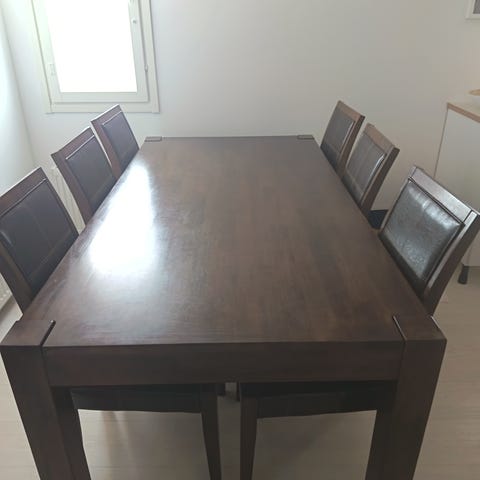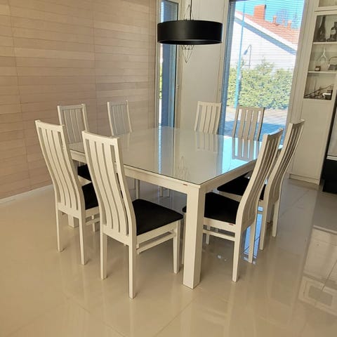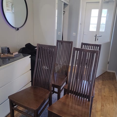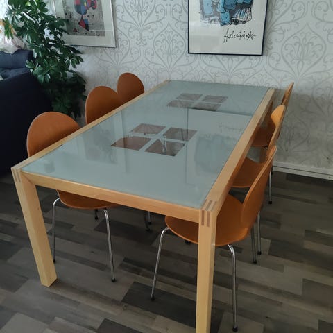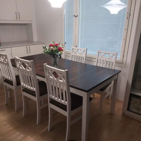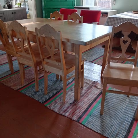 Vanhaan oveen tehty pöytä, lasikansi teetätetty päälle. Tuolit ehjät. Käytönjälkiä on, mutta hyväkuntoiset. Istuinpäälliset (vaalea beige) saa mukaan.