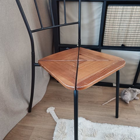 4 kpl metallirunkoisia tuoleja. Istuinosat ja selkänojat ehjät (ei reikiä tai halkeemia)