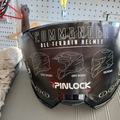 Kirkas naarmuuntumaton kypärän visiiri Airoh. Käyttämätön ja suojakalvo on edelleen paikallaan visiirissä, jossa on painettu käyttö- ja varoitusteksti sekä merkinnät koosta.