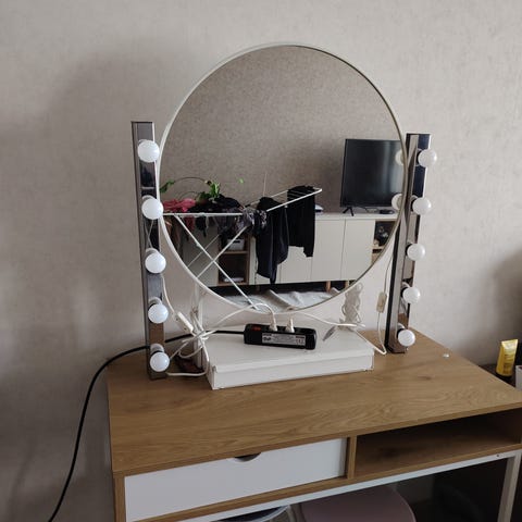 jalallinen meikkauspeili, jossa 2 eri puolta. Toisen puolen peili on lähempi ja tarkempi.