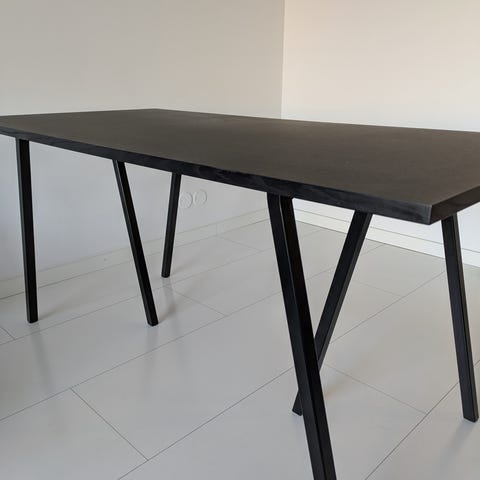 HAYn mattamusta 4:n hengen ruokapöytä. Kunto on muuten oikein hyvä, mutta pöydän pintaan on jäänyt jälkiä. En tiedä olisiko niitä mahdollista saada puhdistettua jotenkin. Pinta on sinänsä siis aivan ehjä.
