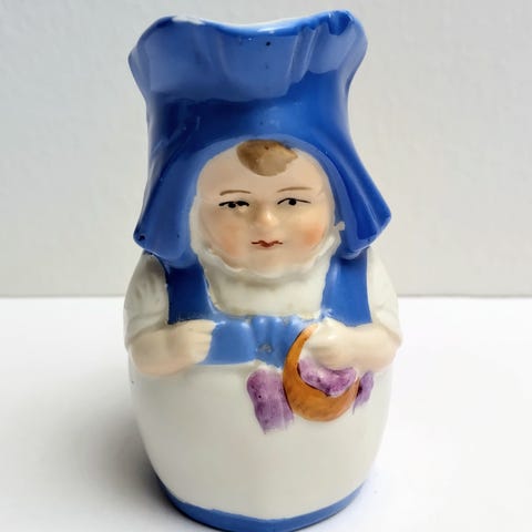 kannu, kaadin, keraaminen kannu, kasvokannu, hahmokannu, pallokuvioinen, pilkullinen, vintage, retro, kitsch, keräily, sisustus, maitokannu, koriste-esine