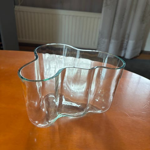 Iittala Aalto maljakko kirkasta lasia. Muotoilijana Alvar Aalto, tunnistettava orgaaninen aaltoileva muoto. Sopii kukka-asetelmille tai sisustusesineeksi. Väri kirkas, materiaali lasi.