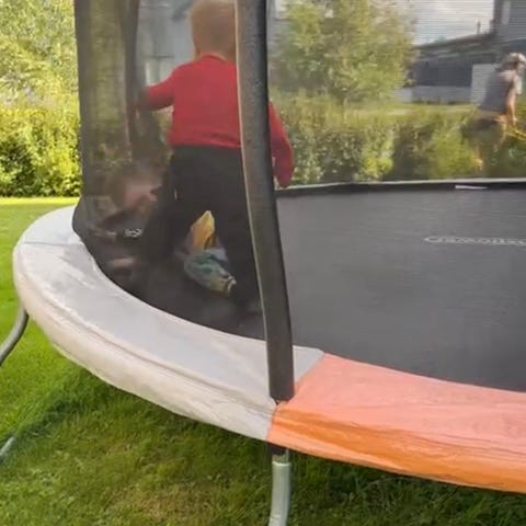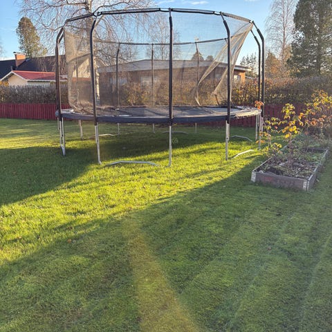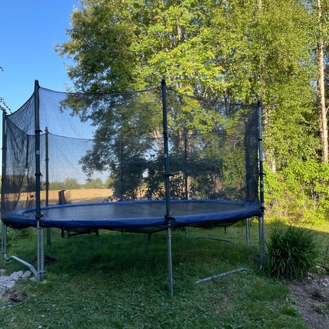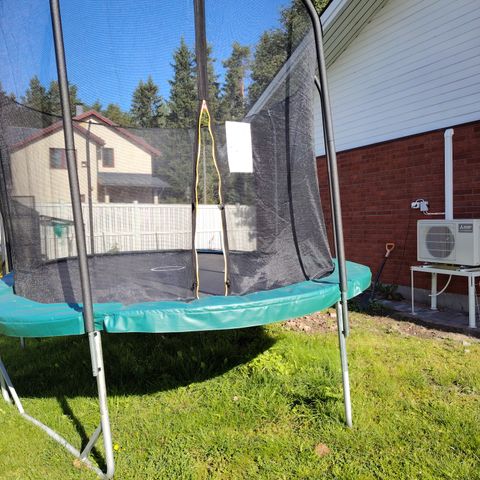 Trampoliinin rungolla, matolla ja jousilla 10 vuoden takuuta jäljellä 6 vuotta.