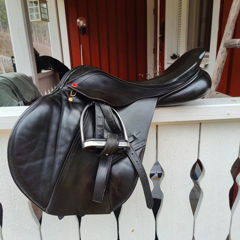 16,5" ruskea englantilainen estesatula hieman kaarevaan ja leveään selkään, hyvä rangan tila. kunto hyvä, toppaukset suht pehmeät. Mukava satula istua ja aikuinenkin mahtuu hyvin.