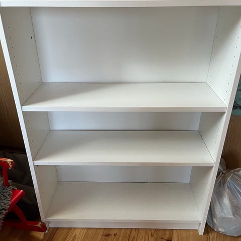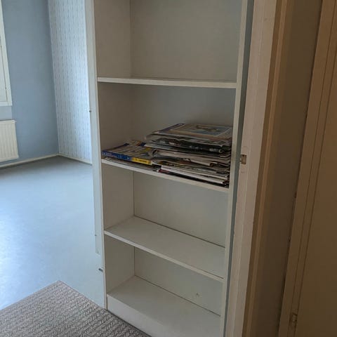 Hyväkuntoinen valkoinen Kallax-hylly. Hyllyyn oli kiinnitetty koulupöytä, josta jäljet yhdessä neliössä, mutta ei vaikuta käyttöön.