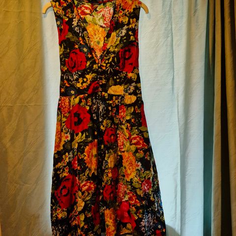 H&M naisten kesämekko, koko 40. Materiaali 100 % puuvillaa. Mekossa on kirjava, graafinen kuosi vaalealla ja tummalla sävyllä. Olkaimellinen, pitkä malli. Hoito-ohjeiden mukaan konepesu sallittu. Sopii arki- ja vapaa-ajan käyttöön lämpimiin säihin. Pituus noin 108 cm.