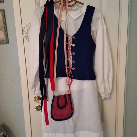 Pukuun kuuluu paita, liivi, hame, päänauha ja koru. Ei tahroja tai värjäytymiä.