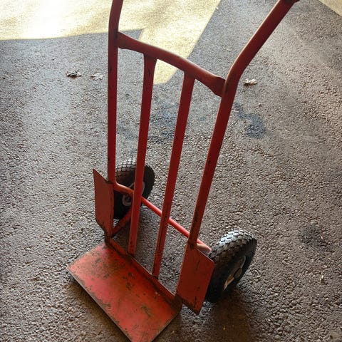 Vankkatekoinen hitsauskärry pullotelineellä. Kelkan pituus 110cm, leveys 25cm, kokonaiskorkeus pyörien kanssa 131cm.