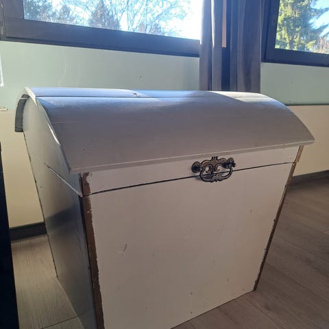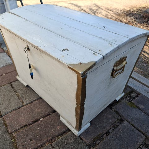 Kannellinen puuarkku, kansi kestää istumista.