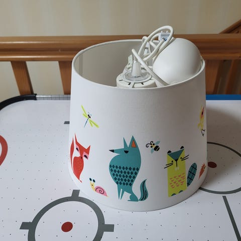 Hyväkuntoinen lastenhuoneen eläinkuvioinen kattovalaisin. Valkoinen valaisin jossa vaaleanvihreitä eläinkuvioita.