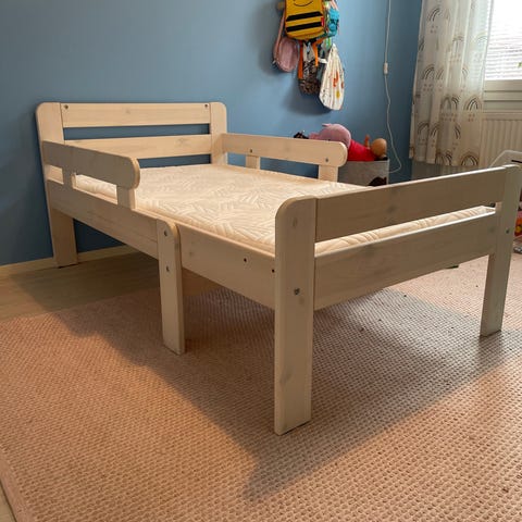 Laadukas suomalainen jatkettava lastensänky + paksu patja (155–195 cm, leveys 80 cm)