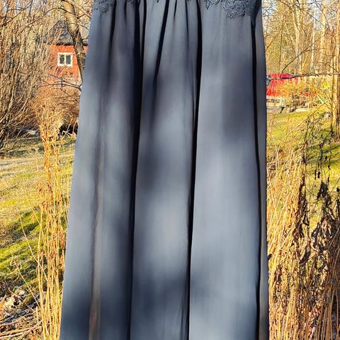 Pelkistetyn kaunis tumman sininen mekko. Hyvin laskeutuva, tukeva, ei helposti rypistyvä kangas. Kangas sisäpuolelta satiinimainen (ei tarvitse alushametta), ei näy läpi. Sivusaumoissa siistit, lähes huomaamattomat taskut. Juuri tyylikkäästi polvet peittävä mitta.