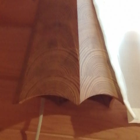 Jalka koivua, varsi harjattua terästä, säädettävä/käännettävä osa, jolloin valo on helppo kohdistaa haluttuun kohtaan. Johdossa katkaisija, johdon pituus noin 180 cm.