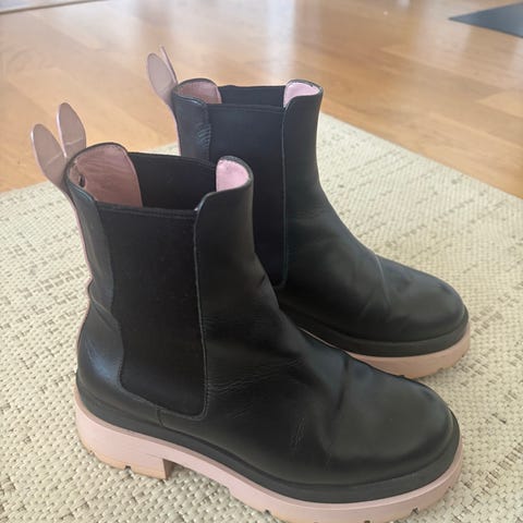 Minna Parikka saappaat, koko 36. Pitkävartiset, mustat saappaat korkealla korolla. Materiaalina sileäpintainen nahka tai nahkajäljitelmä ulkopuolella ja nahkapohja. Korot ovat kapeat ja pohjassa on pieni korokepohja. Koroissa kaunis pinkki väri. Sopivat esimerkiksi juhla- ja arkipukeutumiseen viileämpiin säihin. Kengissä näkyy kuvien perusteella normaalia käyttökulumaa erityisesti koron alueella ja pohjissa. Oikean kengän korossa pieni vekki.