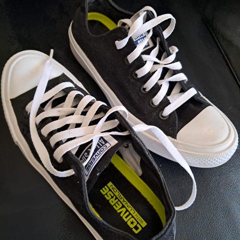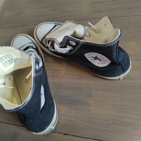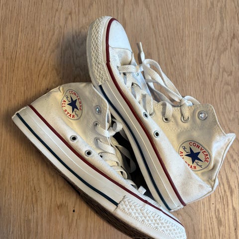 Converse All Star tennarit, koko 39,5. Korkeavartiset kangastennarit ruskealla päällisellä ja vaalealla kumipohjalla. Nauhakiinnitys ja pyöreä kuminen kärki.