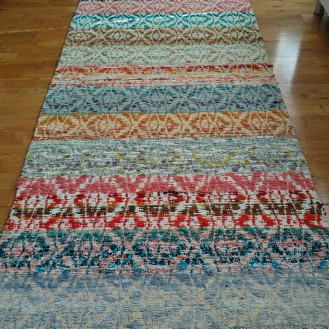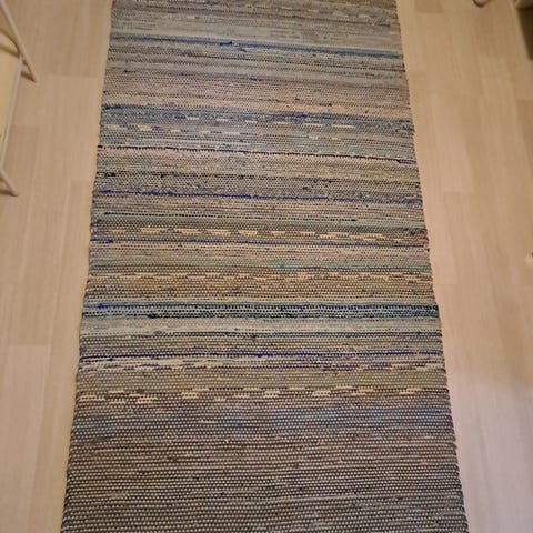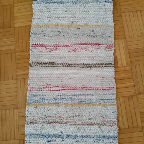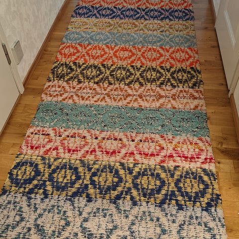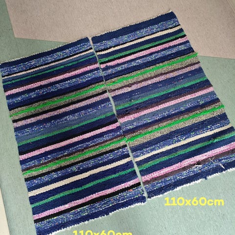 Myydään värikäs 1960‑luvun käsinkudottu räsymatto.