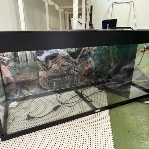 Teetetty mustakehyksinen JuTa- akvaario. Joitakin naarmuja ja saostumia on mutta kohtuukuntoinen, ehjä ja vedenpitävä. Neljä kansilasia, joissa ruokinta-aukot, jossakin reunassa pieni pala lähtenyt. Halutessa saa mukaan akvaarion alla näkyvän vesivanerin ja solumuovin. Lipasto ei kuulu kauppaan.