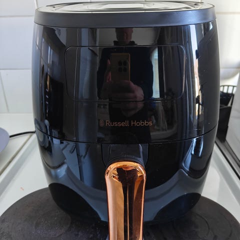 Russell Hobbs airfryer, väri musta. Sähköinen rasvakeitin/ilmafritteri, jossa irrotettava paistoastia vetokahvalla. Soveltuu ruoan kypsentämiseen kuumalla ilmalla ilman uppopaistamista.